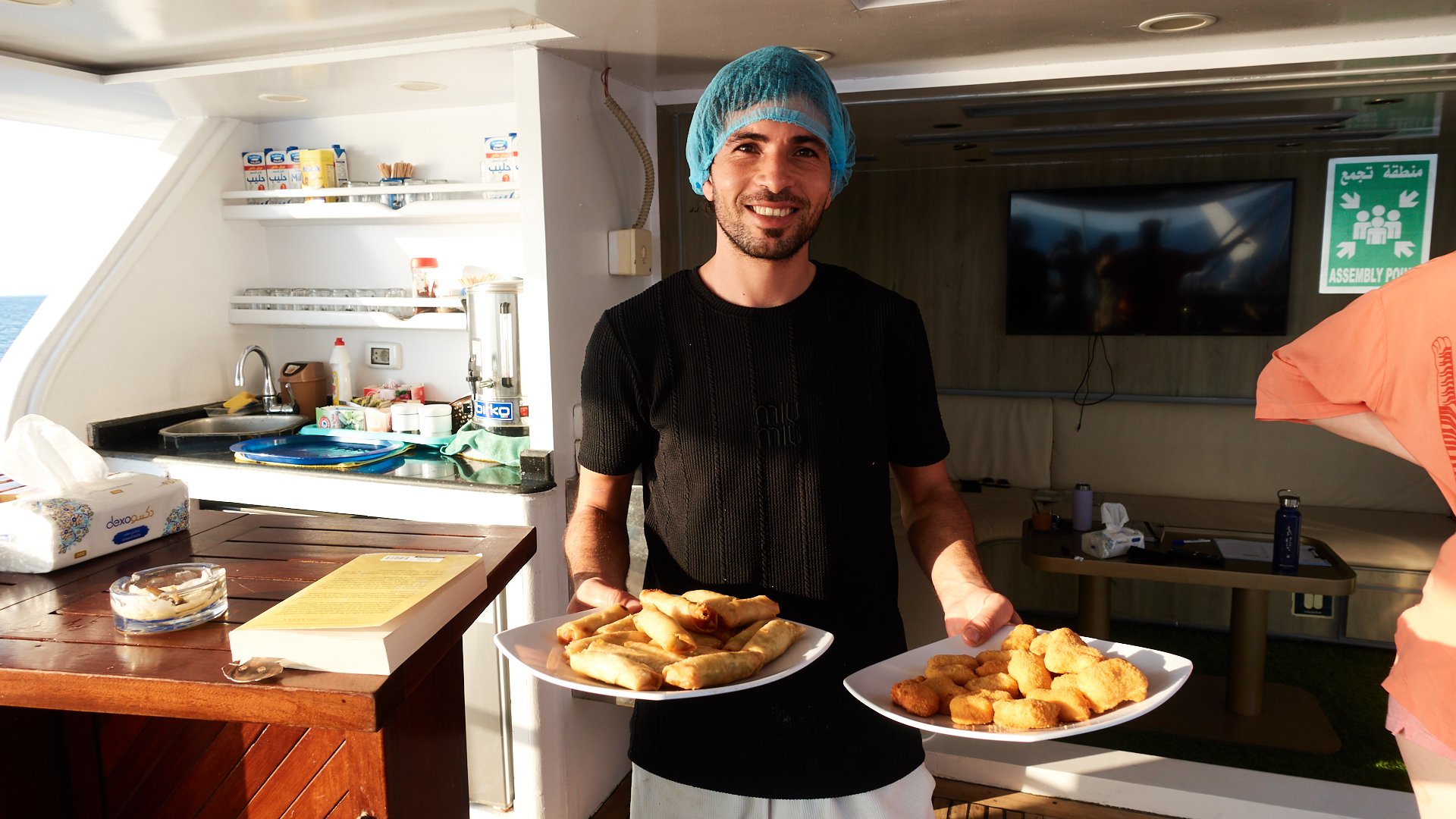 Service ist, wie man es auch aus Ägypten kennt, wirklich top: Hier wird einem jeder Wunsch fast von den Lippen abgelesen. Beim Anziehen der Ausrüstung wird selbstverständlich geholfen, alles läuft aufmerksam, freundlich und angenehm effizient. Nach dem Tauchgang gab’s oft heiße Schokolade oder frische Fruchtdrinks – und nach dem dritten Tauchgang warteten schon die nächsten Snacks.